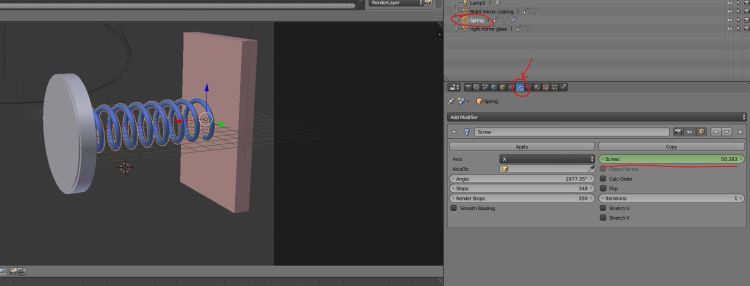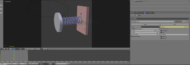 The spring also needs to be animated. In contrast to the mirror, the spring does not need to be translated left and right along the X axis, but needs to expand and contract while remaining fixed to the support block. This is achieved by employing keyframes as previously, but applied this time to the spring’s screw modifier (see below).