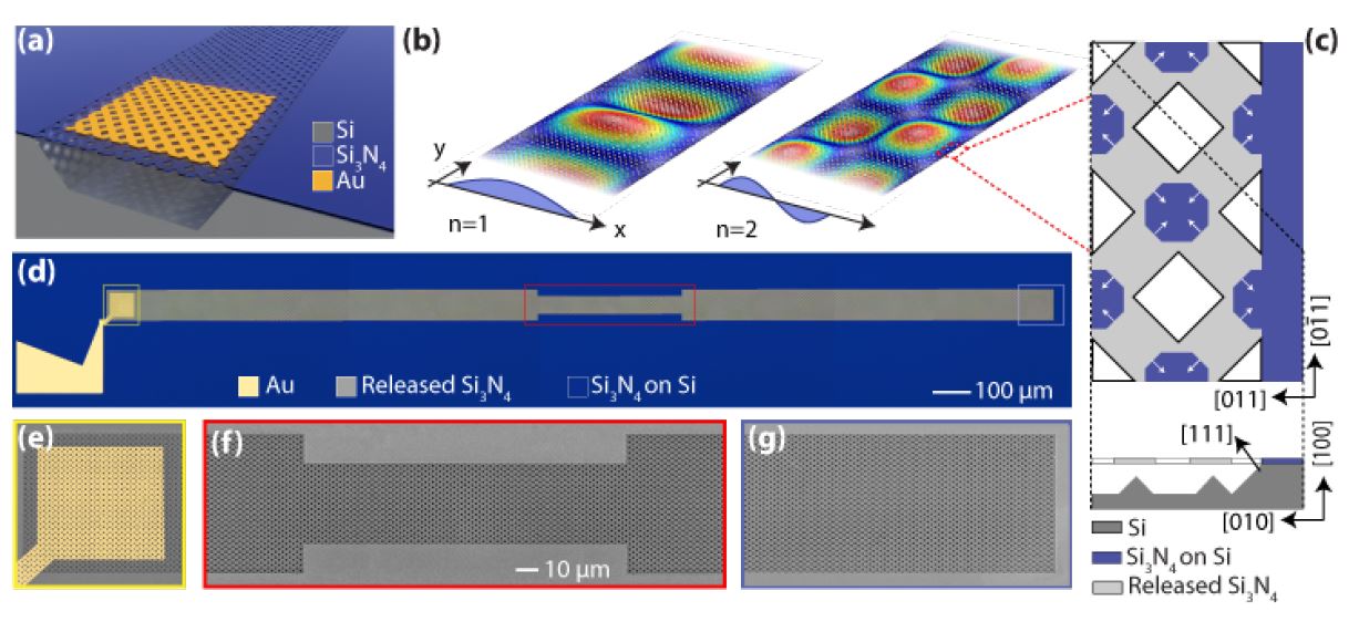 Figure 3. Meshed phononic waveguide fabrication. (a) Schematic of the meshed silicon nitride membrane released from the