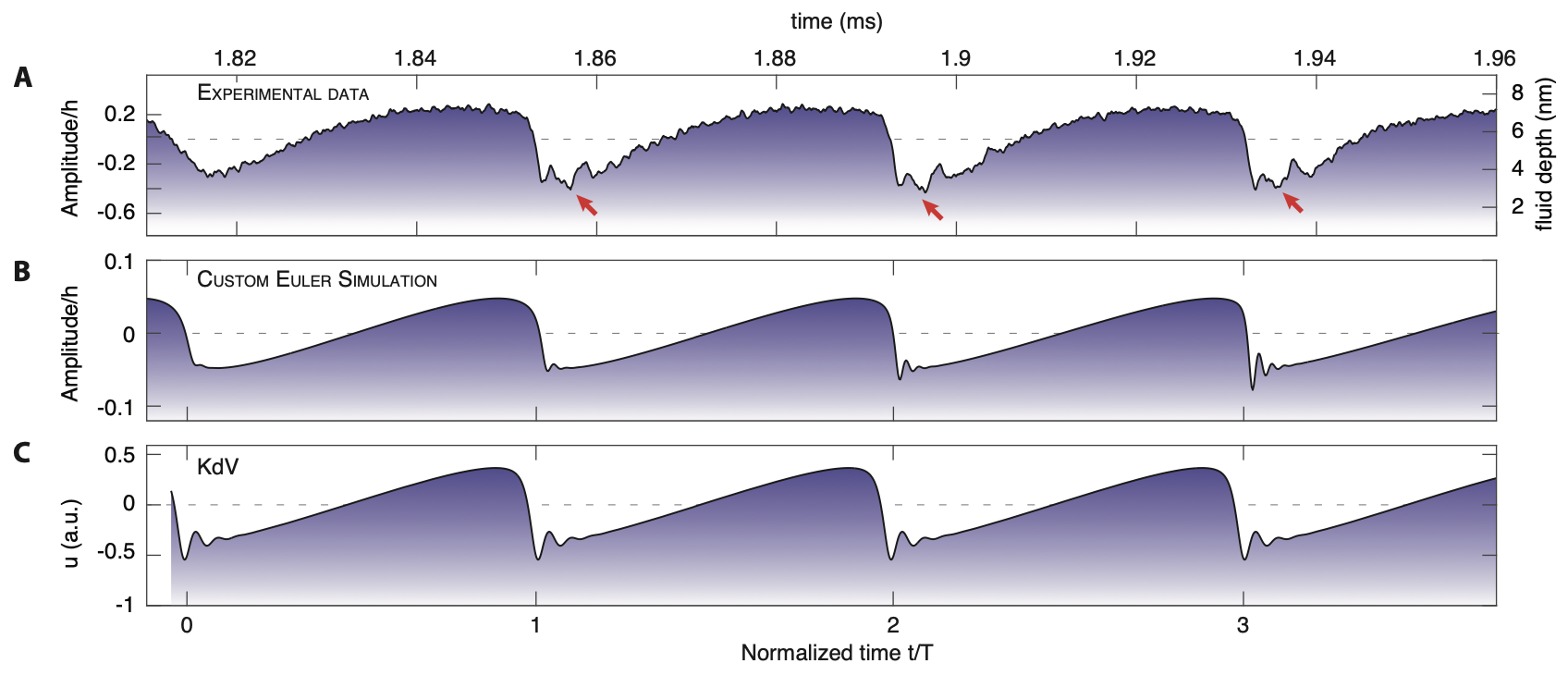 (A) Observation of dispersive shock fronts. Red arrows: signatures of soliton fission. (B) Custom Euler model, including counter-propagation and van der Waals nonlinearities, obtained by evolving a sinusoidal wave initialized with am- plitude H = 0.1h (with computation taking ∼ 4 days on a desktop PC). More details: Supple- mentary Materials, Section 5. (C) KdV solution obtained using Eq. (1).